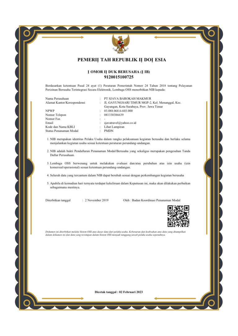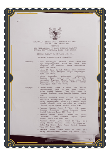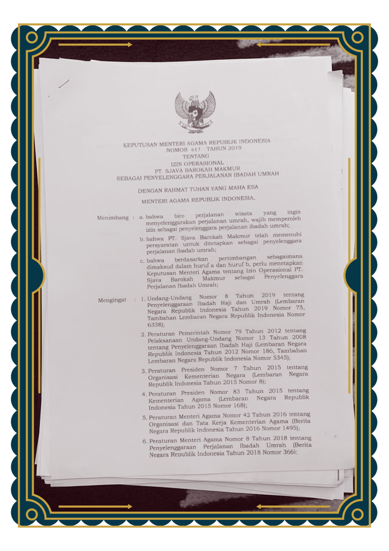 Alhamdulillah perjalanan ibadah Umroh Anda akan menjadi tenang dengan berlegalitas Resmi yaitu Penyelennggara Ibadah Umroh no. 617 tahun 2019
