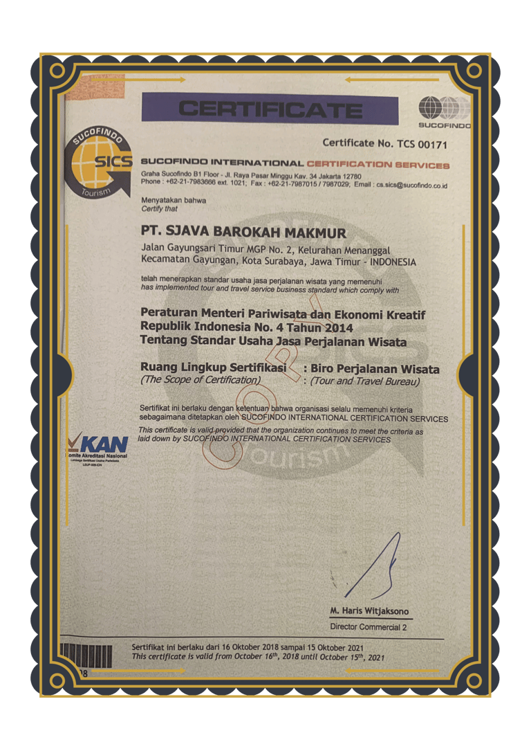 telah menerapkan standar usaha jasa perjalanan wisata yang memenuhi syarat Peraturan Menteri Pariwisata & Ekonomi Kreatif Republik Indonesia no. 4 Tahun 2014 tentang Standard Usaha Perjalanan Wisata